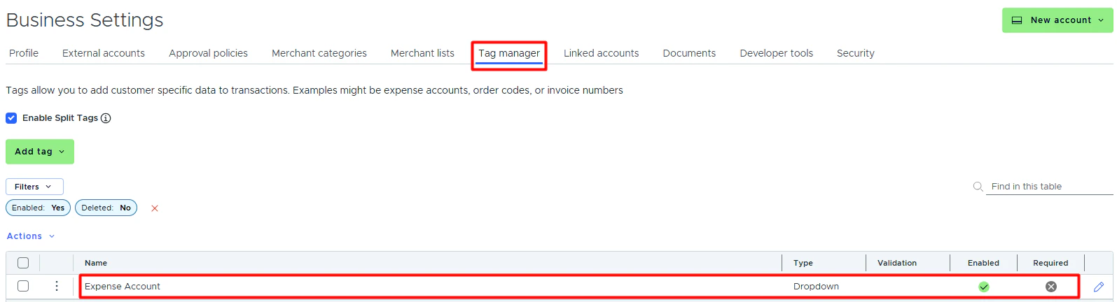 - If the “Required” checkbox is checked, cardholders must tag a transaction with it.
