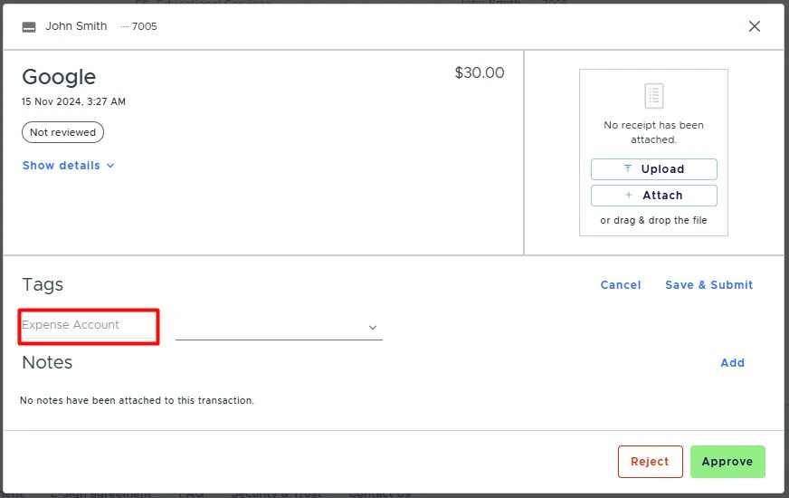 - On the PEX transaction details screen, so you and your Cardholders can tag transactions.