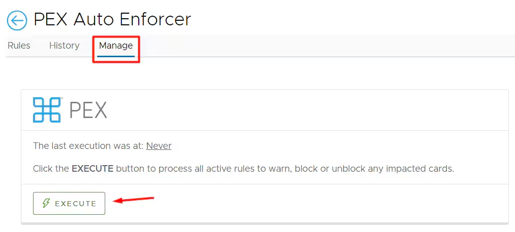 - For testing purposes or to run the rule(s) against transactions immediately, click the “Execute” button under the Manage tab.