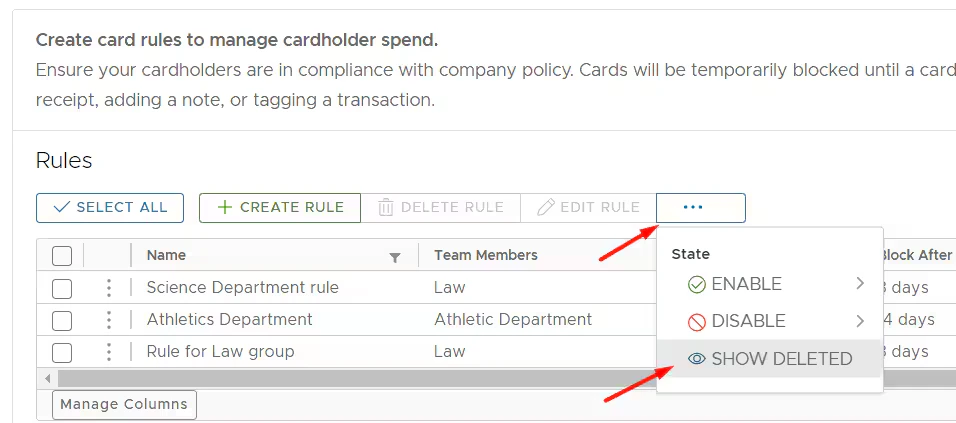 - Team member vs. Vendor cards: if you would like to create rules for employee cards only, deselect the “Show vendor cards” checkbox.