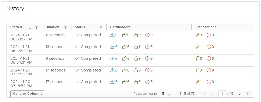 The “History” tab shows a history of auto-blocked and unblocked cards. Note that the list incudes cards that have been blocked/unblocked by Auto Enforcer only. If you manually unblock the card, it will not be on this list. In the “Cards” table, you can review details, including the affected card, the time of the event, whether the card was blocked or activated, the rule it violated, and the missing items that its transactions lacked. Clicking on the card name will redirect you to a card details page.Manage
