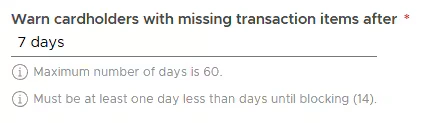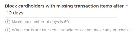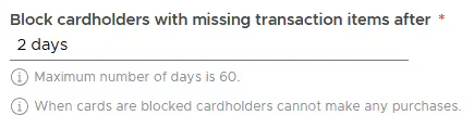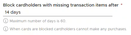 - If a cardholder does not add the missing transaction items within the inputted number of days after the transaction is made, the card will be auto-blocked.