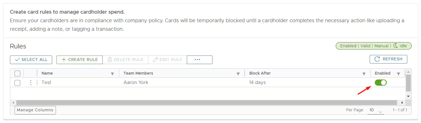 You have created the card rule. Now let’s set up Auto Enforcer to run the rule(s) against transactions:- Ensure the rule is enabled.