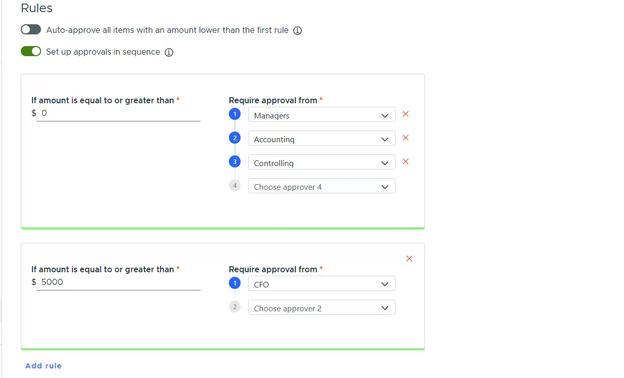 - Create a rule by entering the first threshold amount that will require approval from a certain admin group.