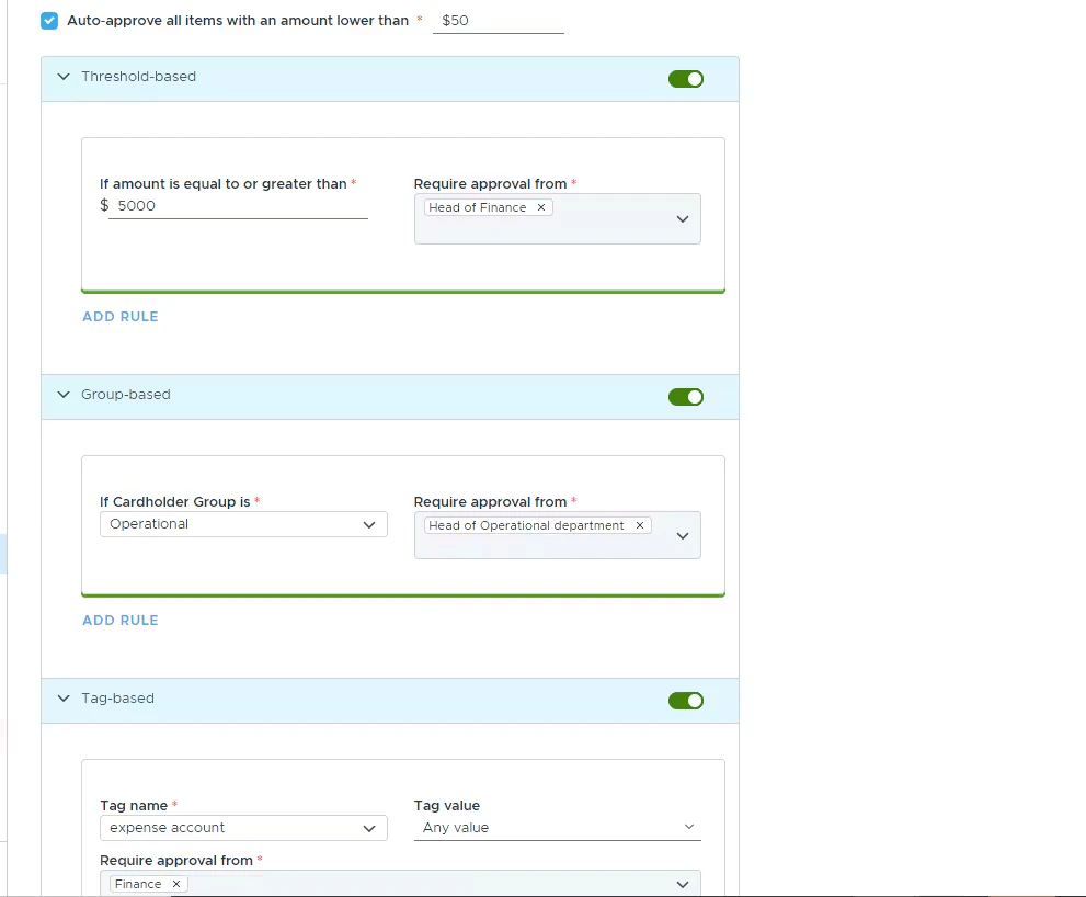 - come from the ‘Operational’ cardholder group that are also tagged with the ‘expense account’ tag will require approval from the ‘Head of Operational’ and ‘Finance’ groups