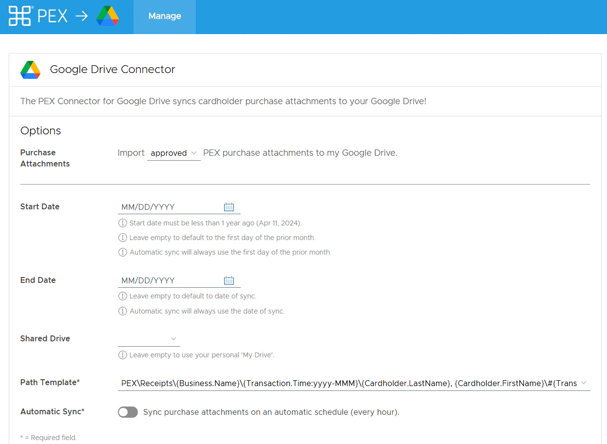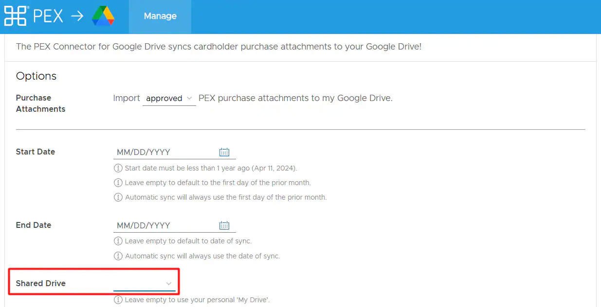 - Shared Drive - If you have multiple shared drives available you can select them here, or leave it blank to sync your personal “My Drive”.