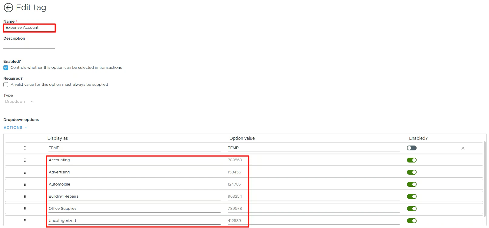 Note that a purchase will not be tagged with this default value (“Uncategorized” in our example) on the purchase details. It means that if you or your cardholders forget to tag a purchase before it is synced to Dynamics 365, the default value (“Uncategorized” in our example) will be applied to this purchase during the sync. If you or your cardholders do tag a purchase with the tag option from the tag chosen in the highlighted field below,