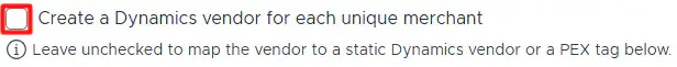 If you have left the “Create a Dynamics vendor for each unique merchant” unchecked, you can map the vendor to a single static Dynamics 365 vendor called “PEX”.