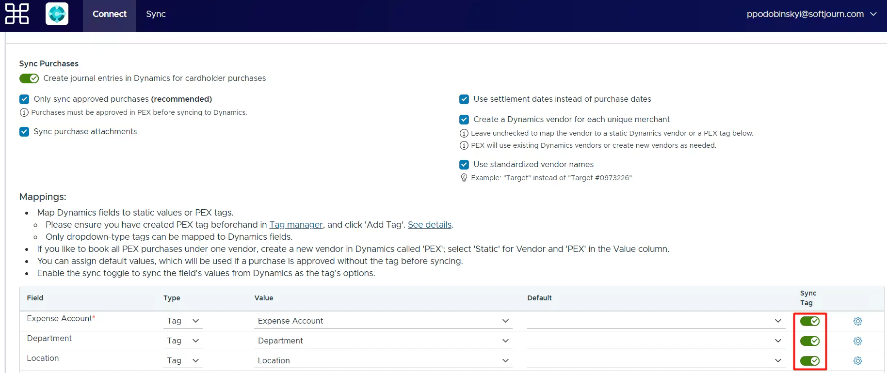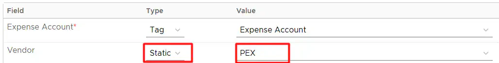 Purchase Field Mappings Map Dynamics 365 fields to static values or PEX tags. Fields can be mapped to static values or PEX Tags. If you choose to use PEX tags, you must create them in advance, following the logic described in the “Create PEX tags for Microsoft Dynamics 365” article.   For example, the “Expense Account” is one of the fields on your Purchase: