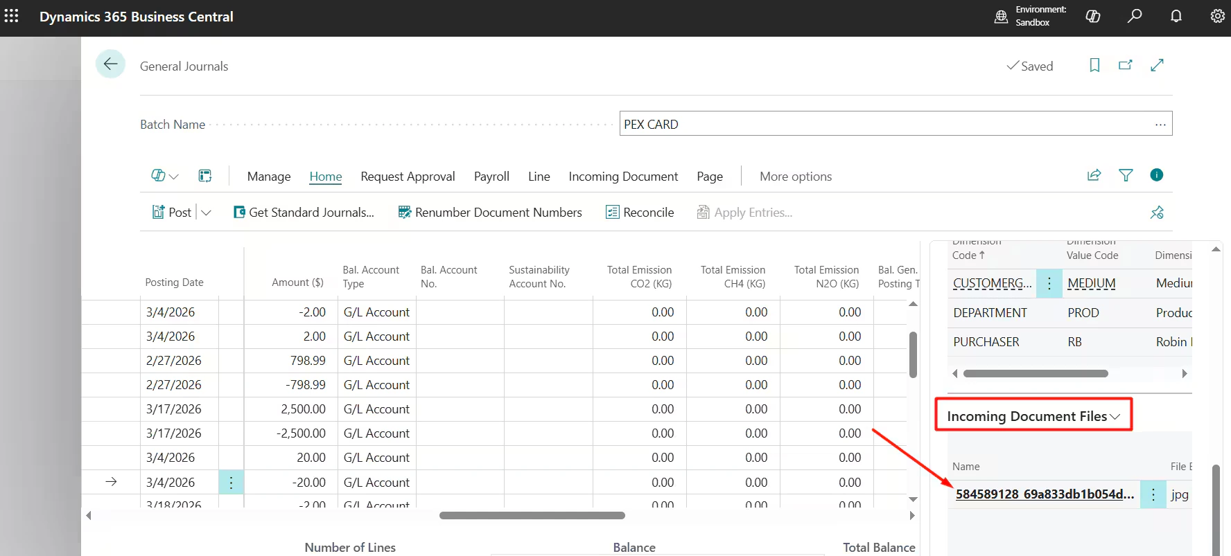 In Dynamics 365 Business Central, go to Finance → General Journals → click on the PEX Card journal →