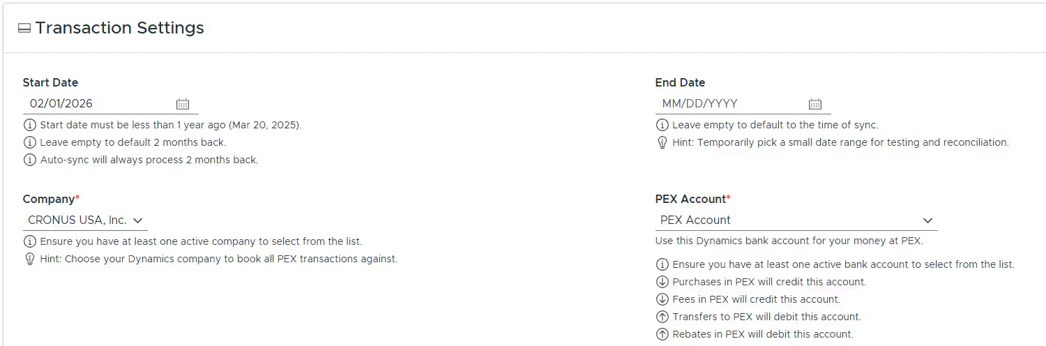Company: Select the Dynamics 365 company to book all PEX transactions against.
