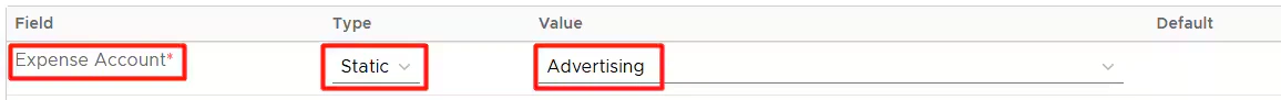 • Mapping the “Expense Account” field to a static value means that you can select one account out of the many presented in Dynamics 365, and that value (“Advertising” in our example below) will be applied to all PEX purchases.