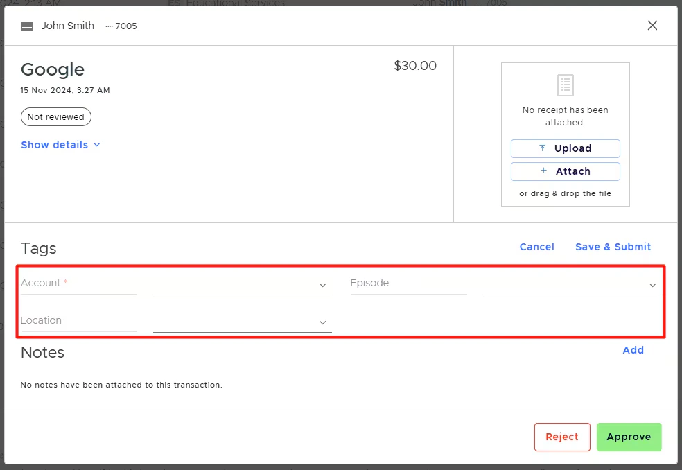 • On the PEX transaction details screen, so you and your Cardholders can tag transactions.