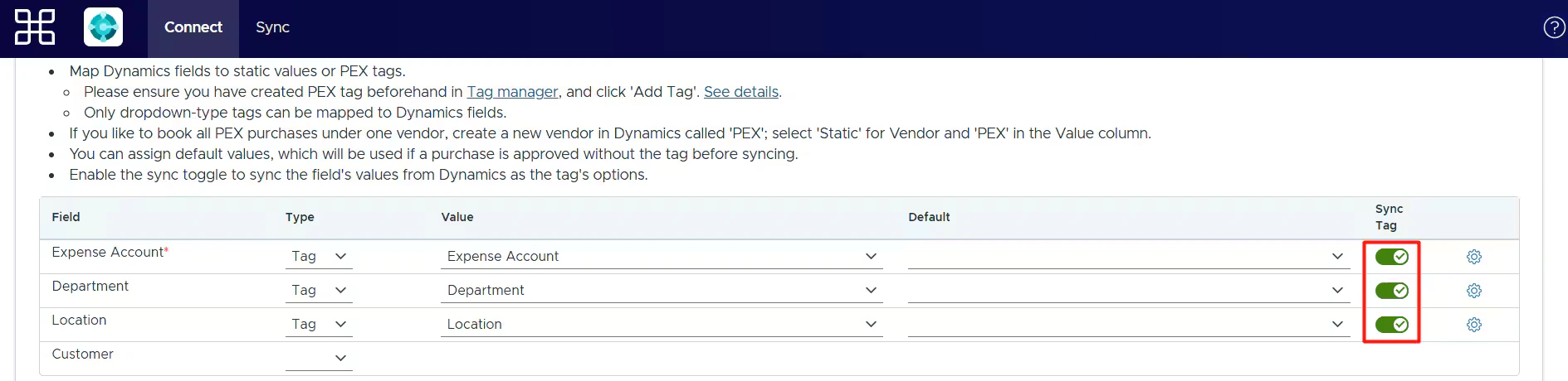Tip:Enable the Sync Tag Toggle in the Dynamics 365 connector Mappings table. This automatically syncs field values from Dynamics 365 into PEX as tag options. For example, the values for a PEX tag “Expense Account” in Tag Manager will be populated with the names of your Dynamics 365 accounts.