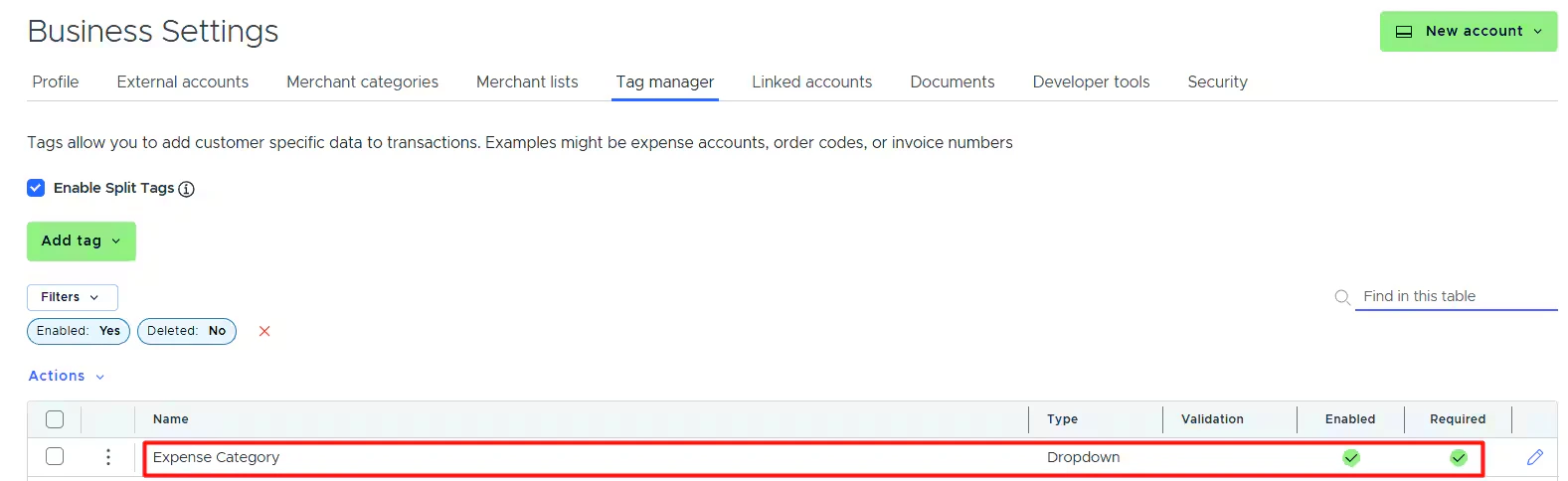 • If the “Required” checkbox is checked, cardholders must tag a transaction with it.