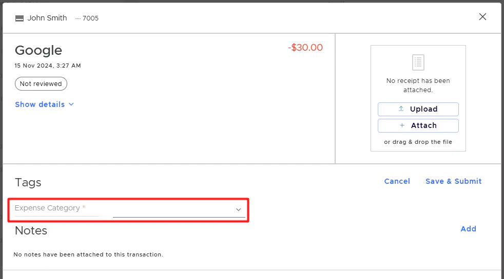On the PEX transaction details screen, so you and your Cardholders can tag transactions.