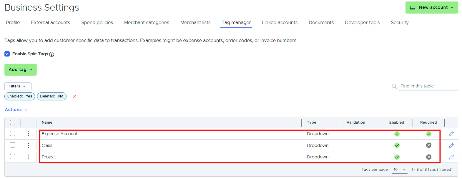 - If the “Required” checkbox is checked, cardholders must tag a transaction with it.