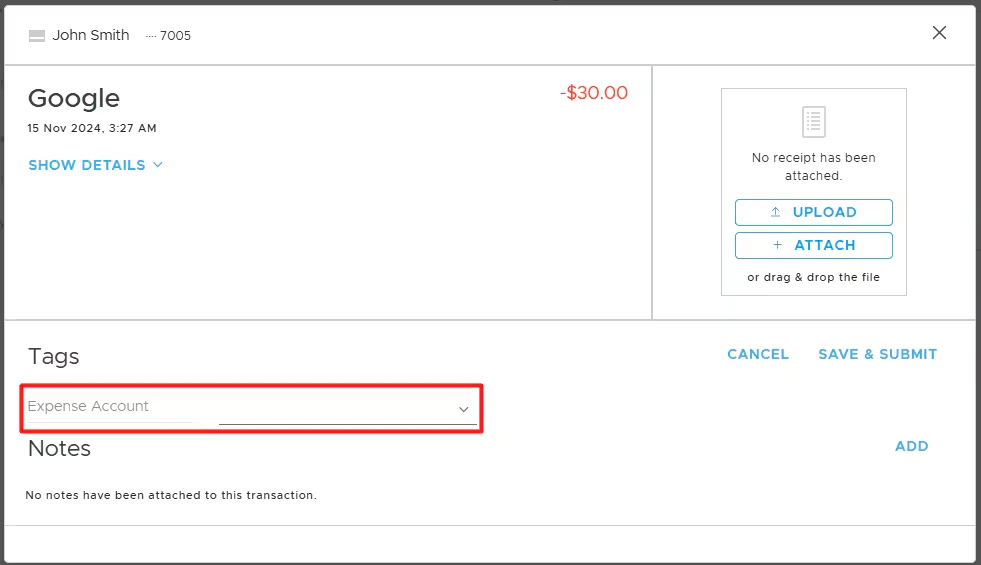 - On the PEX transaction details screen, so you and your Cardholders can tag transactions.