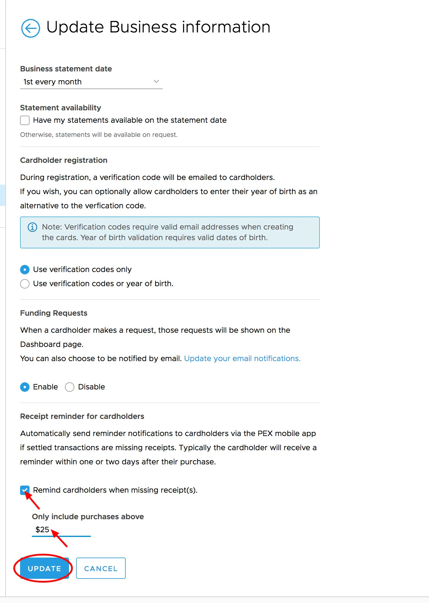 By default, your cardholders will not receive receipt reminders. You must enable this feature in your Business Settings.Log in to dashboard.pexcard.com