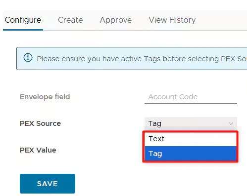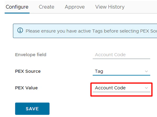 To configure your settings select your Envelope Account Code value:- PEX Source. The source can be: