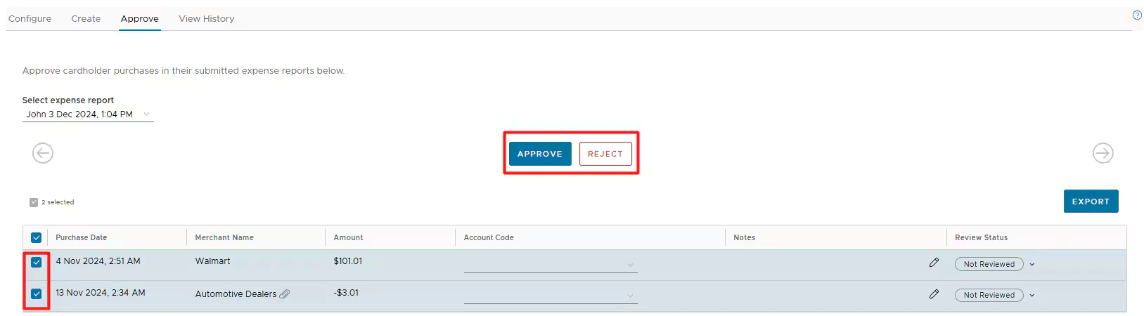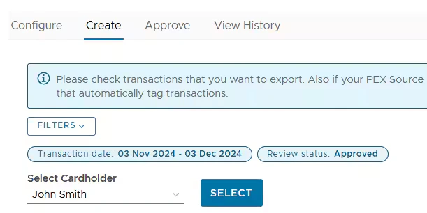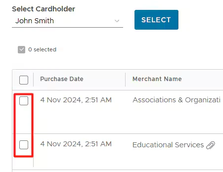 A date range (one month) and approval status (approved) are prepopulated by default. Feel free to edit the dates and approval status as needed. Next, select the cardholder name from the dropdown and click Select. Note: only one cardholder can be selected at a time.