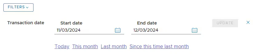 - Transaction date. The limit is up to 1 year. You might use predefined filters: Today, This month, Last month, Since this time last month.
