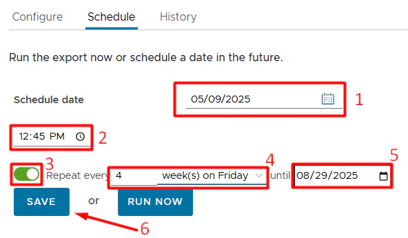 • Run Now: To run the export now, click Run now.