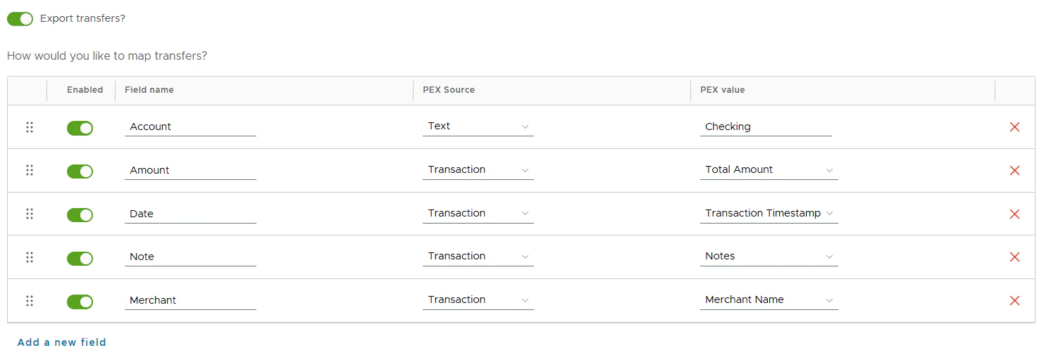 - As soon as you remove a field in one section, it is auto removed in all sections (Export purchases?, Export transfers?, Export bill payments?, Export fees?).