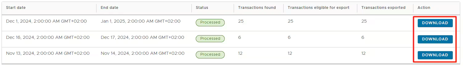 You will see a Download button in the Action column on the History tab once the export file can be downloaded. Click Download to download the file.- If you selected a small date range with a low number of transactions, the export file should be ready for download in less than a minute. If the date range contains a large number of transactions, it may take a few minutes. Simply refresh the screen to get the latest update.
