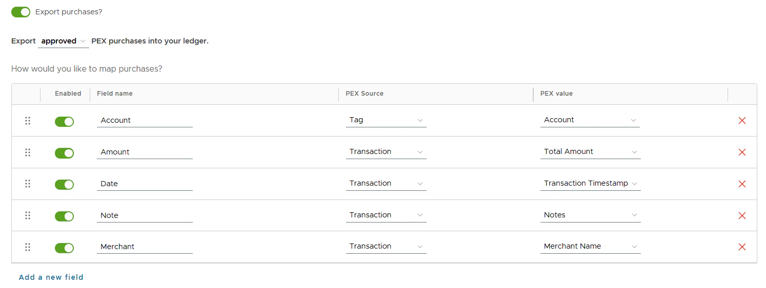 • Enable “Export purchases?” to successfully export PEX purchases, which will update the toggle from grey to green.