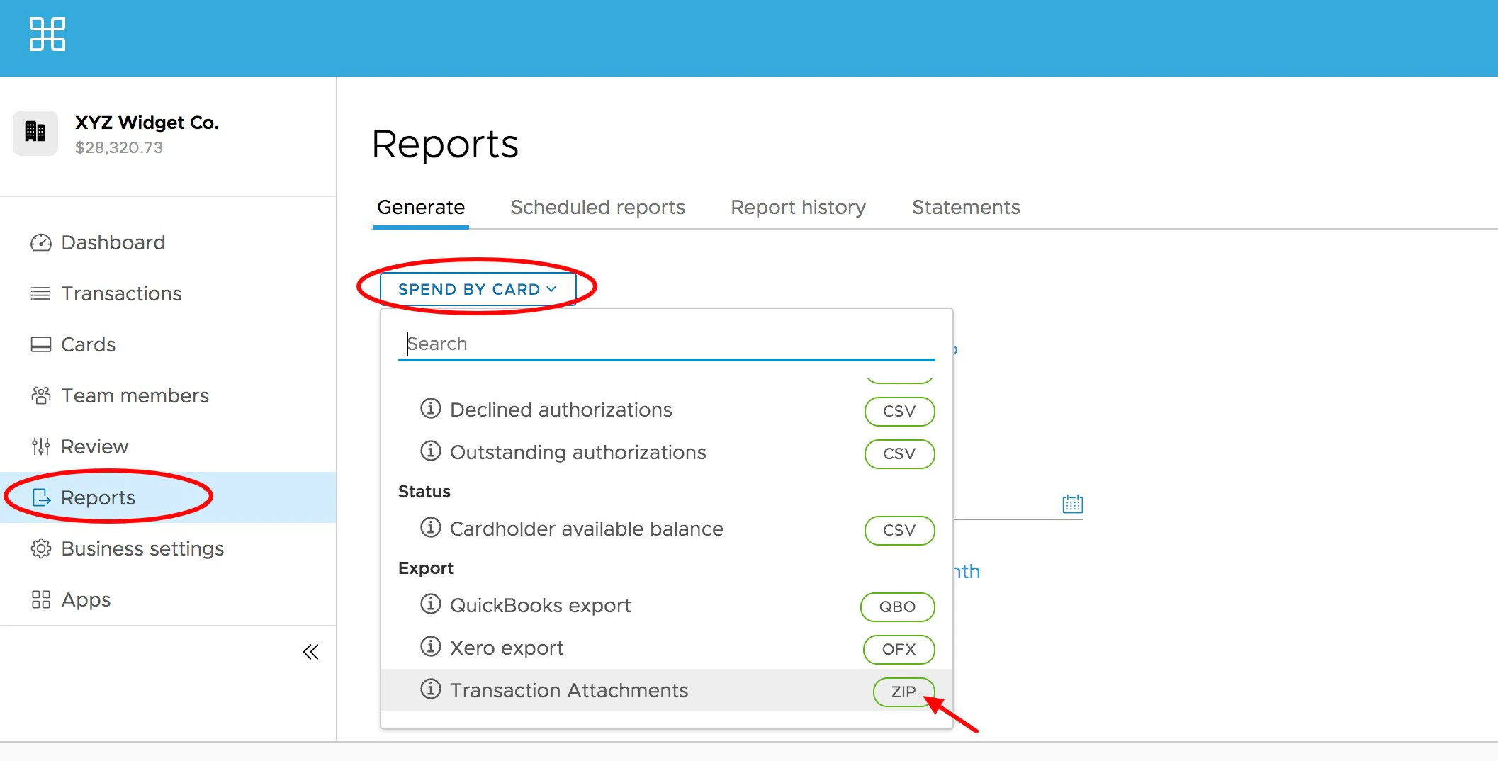Click the button on the “Generate” tab, and select from the drop-down menu “Transaction Attachments”