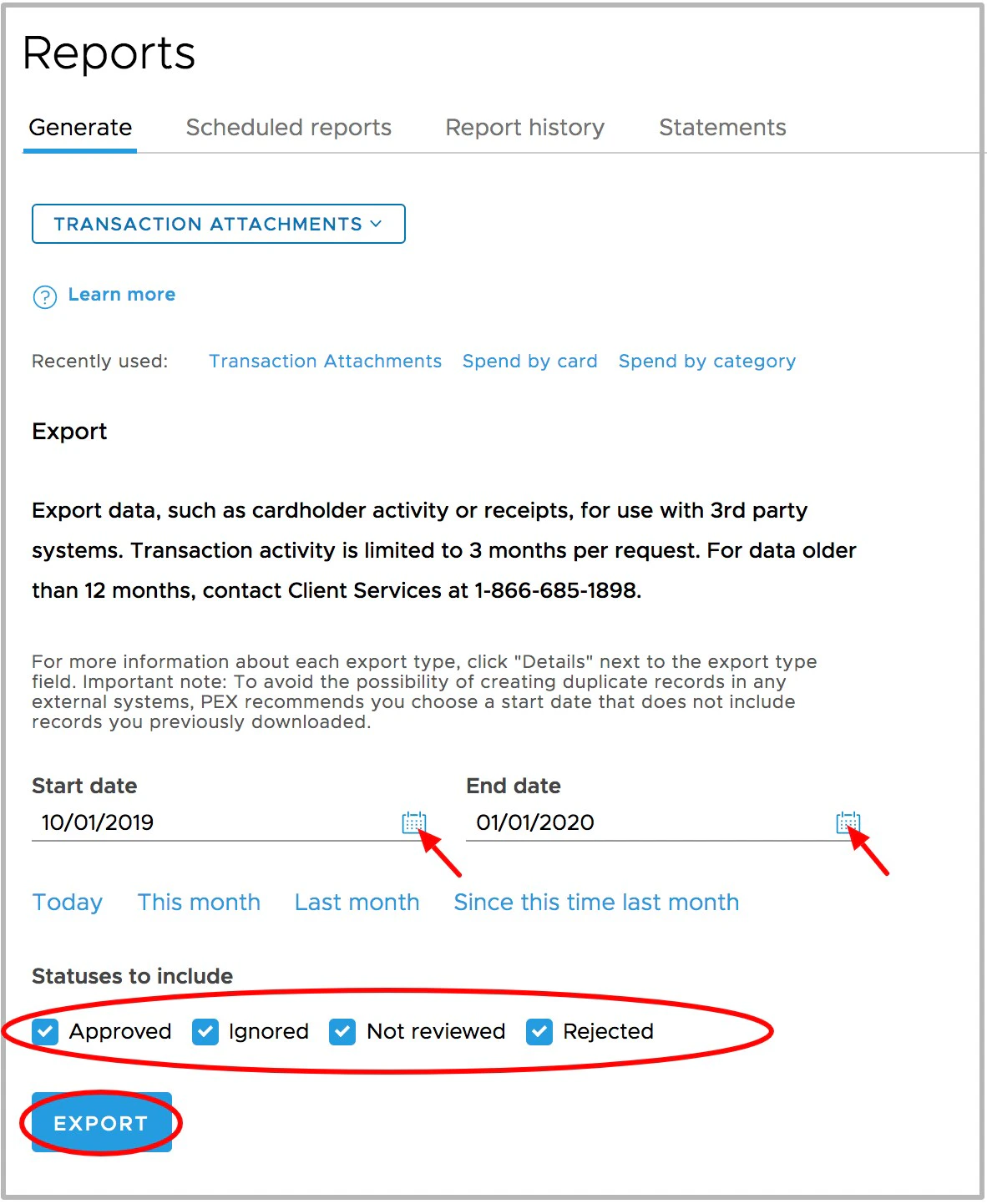 - The archive will have a filename that contains PEX receipts and the date range of the export, as shown here: PEXattachments_20191001_to_20200102_5e6a6744ee23a80b78b56710