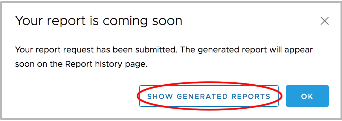 - A window will tell you “Your report is coming soon” with a button to “Show Generated Reports”. This button will take you to the Report History tab