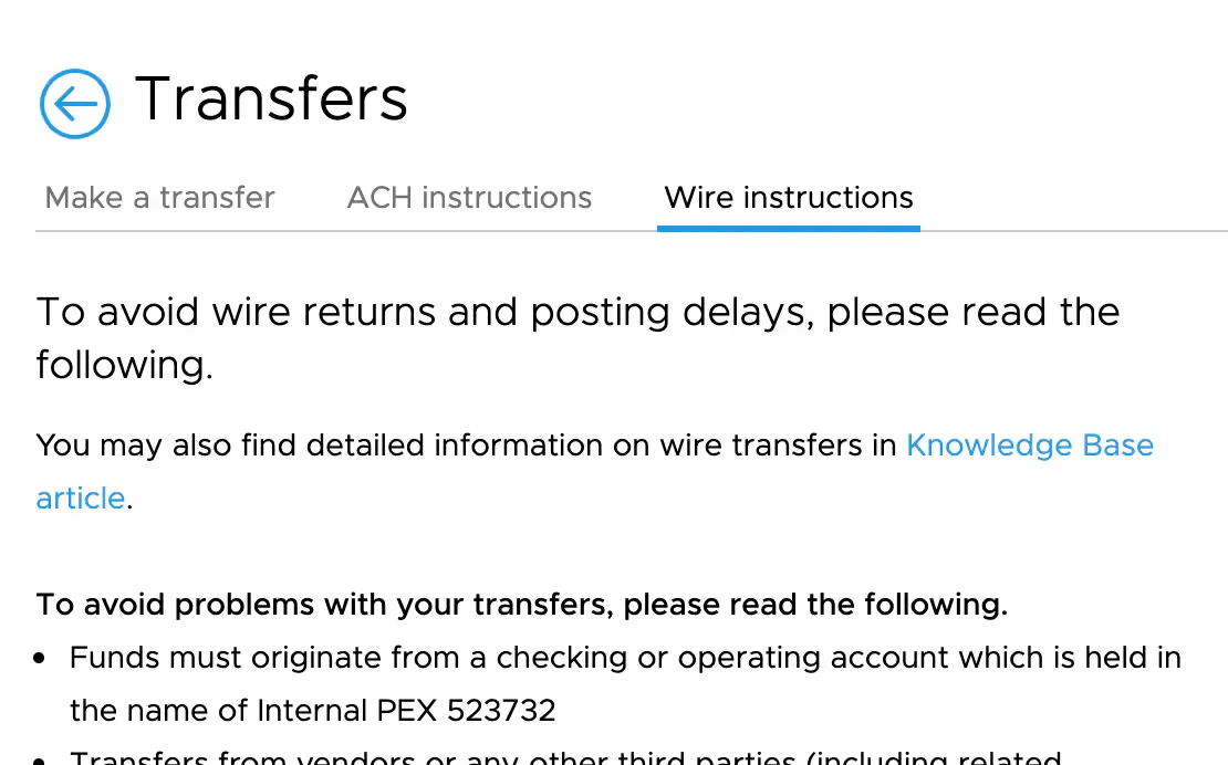 - IMPORTANT: PEX is unable to accept wire transfers from third-party bank accounts.