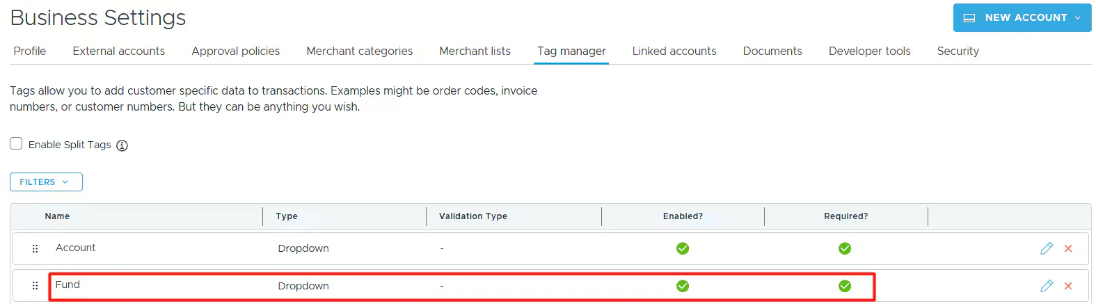 - If the “Required” checkbox is checked, cardholders must tag a transaction with it.