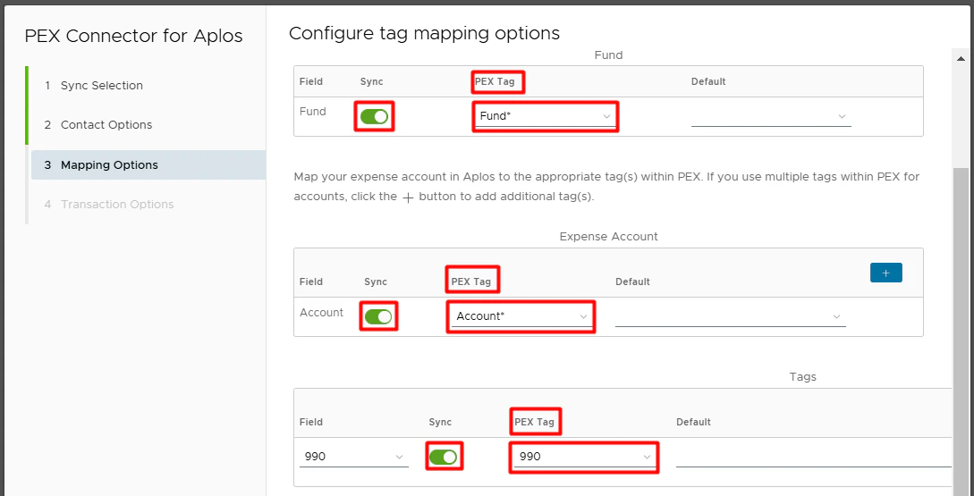 Optionally, you can also add other tags like 990 Tag following the same steps as described for the Account Tag and Fund Tag above. Once the tags are set up, you will also see them:- In the PEX Tag dropdown lists in connector setup steps.