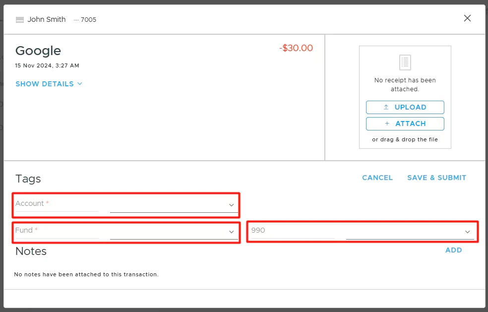 - On the PEX transaction details screen, so you and your Cardholders can tag transactions.