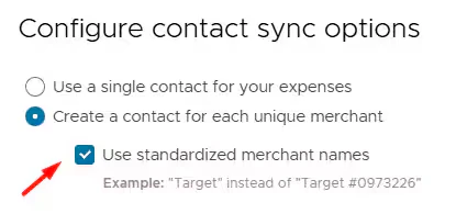 With the “Create a contact for each unique merchant” option, you can also sync your purchases with standardized merchant names if you check “Use standardized merchant names” checkbox.