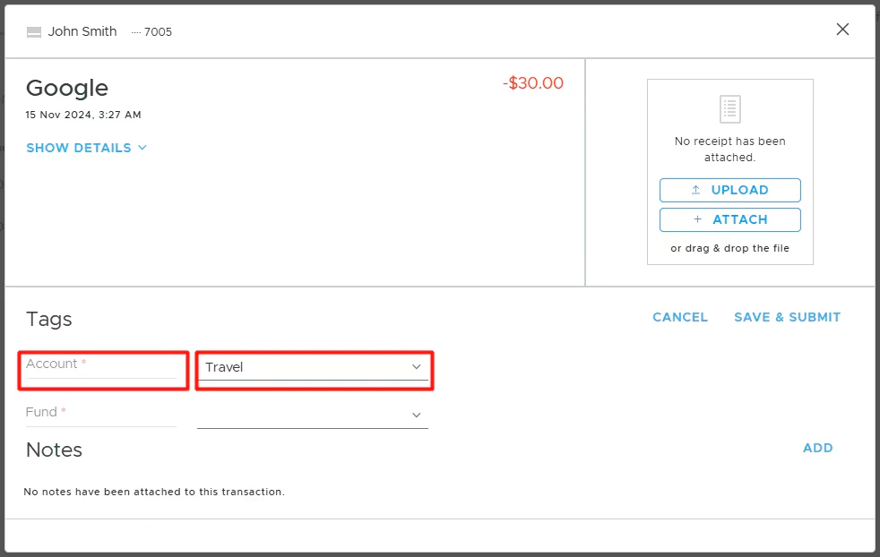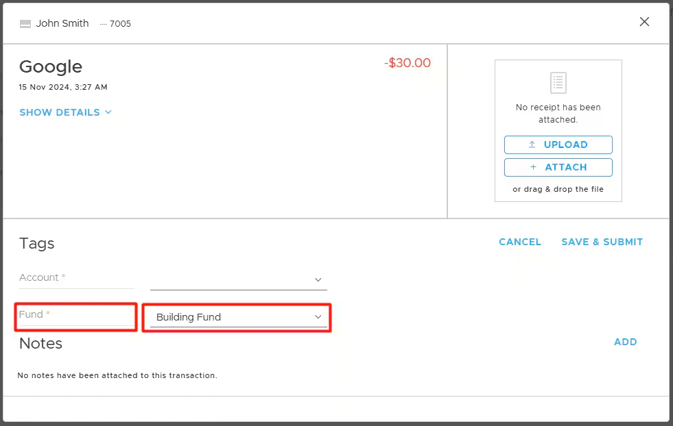 - If a receipt is missing, add it by uploading or dragging and dropping.
