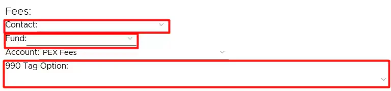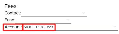 The fee amount will debit an account (“5100-PEX Fees” in our example below) selected in the dropdown field “Account”.