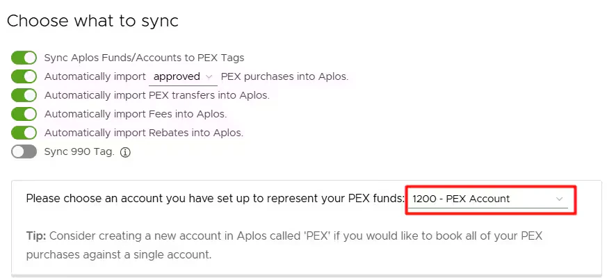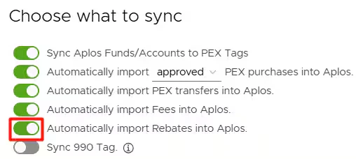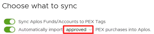 - Enable this option to import PEX purchases as expenses in Aplos.