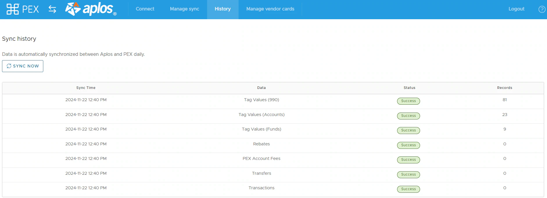 Navigate to the History tab and click “Sync Now” to initiate the sync between PEX and Aplos.