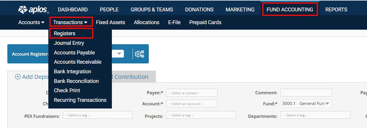 Log into Aplos account and navigate to Fund Accounting -> Transactions -> Registers -> Select a PEX account (“1200-PEX Account” in the example above) to view synced transactions.