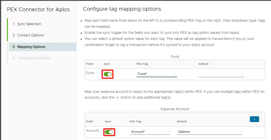 We strongly recommend using automatic sync of tag options from Aplos to PEX. This will keep your PEX tags and Aplos fields in sync. For more information, check out the “Setting up Tags in PEX” section to add tags and test tag options.Once added, enable the “Sync” toggle for fields on the “Mapping Options” step (as shown in the example below).