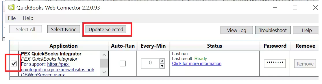 Manual Sync To manually sync, place a check in the box on the left and click Update Selected at the top of the Web Connector.