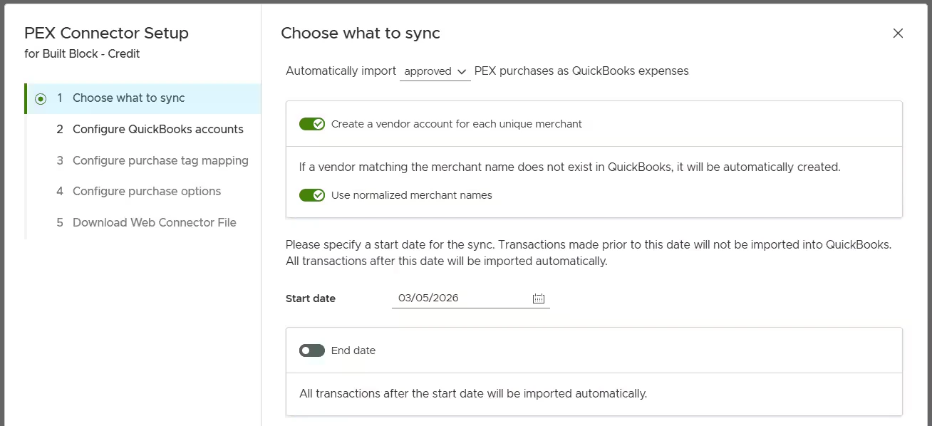 - Purchases to sync — choose all PEX purchases (regardless of approval status) or approved only. For details on transaction review, see How to Review Transactions.