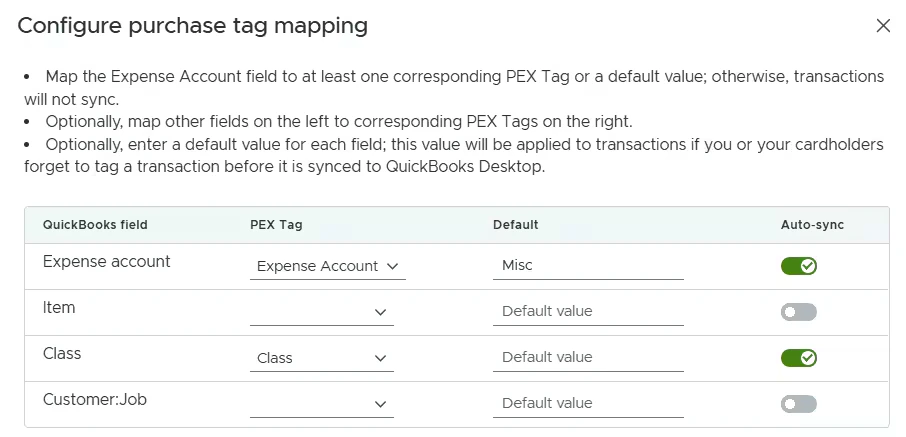 - (Optional) PEX tags created and ready. To ensure purchases sync to the correct accounts or items right away, create tags beforehand. See Create tags for QuickBooks Desktop for instructions.