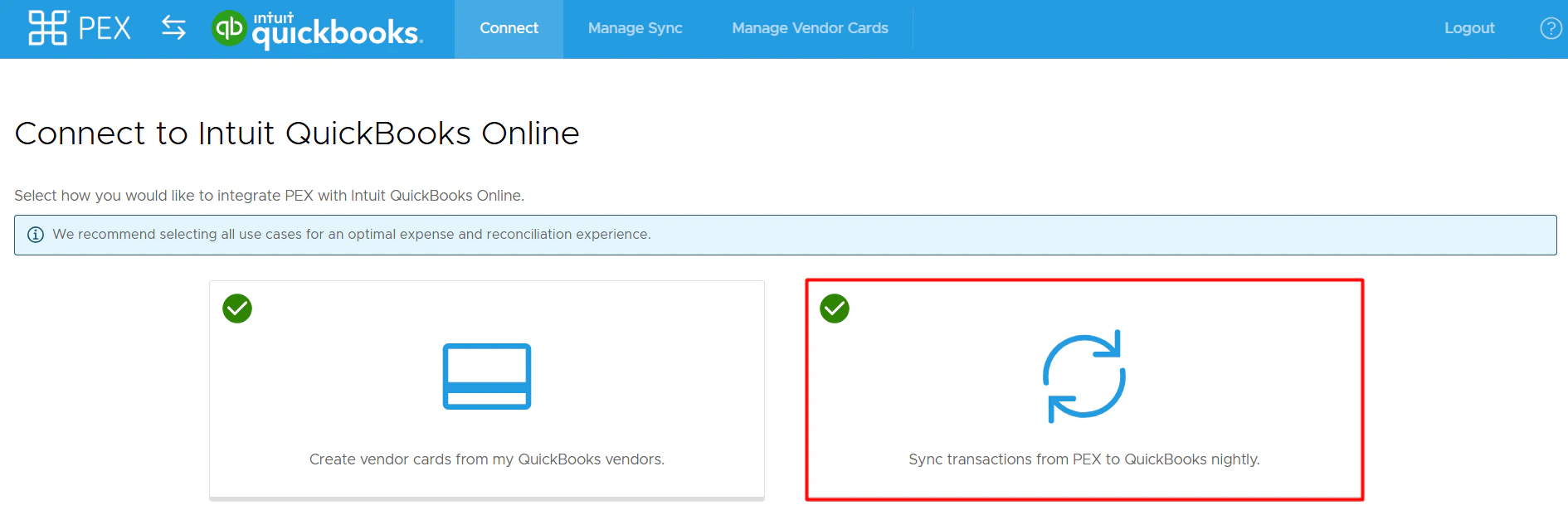 There are currently two options for how you can connect PEX with QuickBooks Online. We recommend as many as possible to make your reconciliation experience seamless.- Create vendor cards from my QuickBooks vendors.