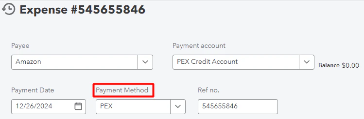 - Expenses — Select a payment method. We recommend creating a payment method called “PEX” to easily track all bills paid in PEX.
