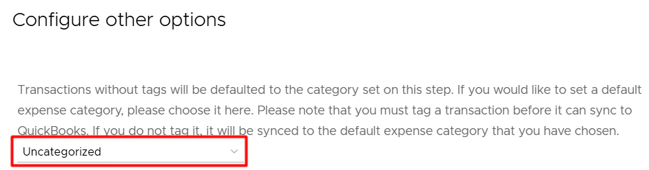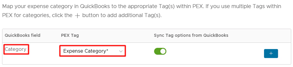 Transaction tags are available with selected plans. Customers without tags will be asked to choose a default category for all transactions.- You can map a QuickBooks field “Category” to a PEX tag. That tag must be created beforehand, following the logic described in the Create PEX tags for QuickBooks Online article.